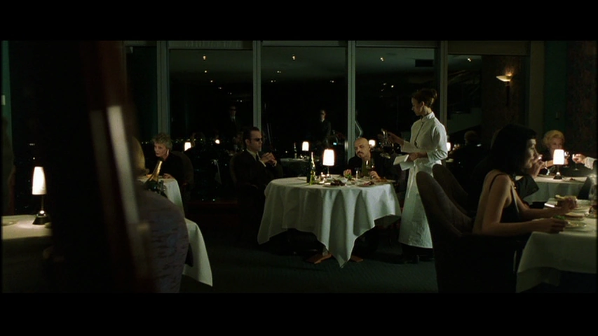 Cypher speaks with Neo while secretly operating the system.